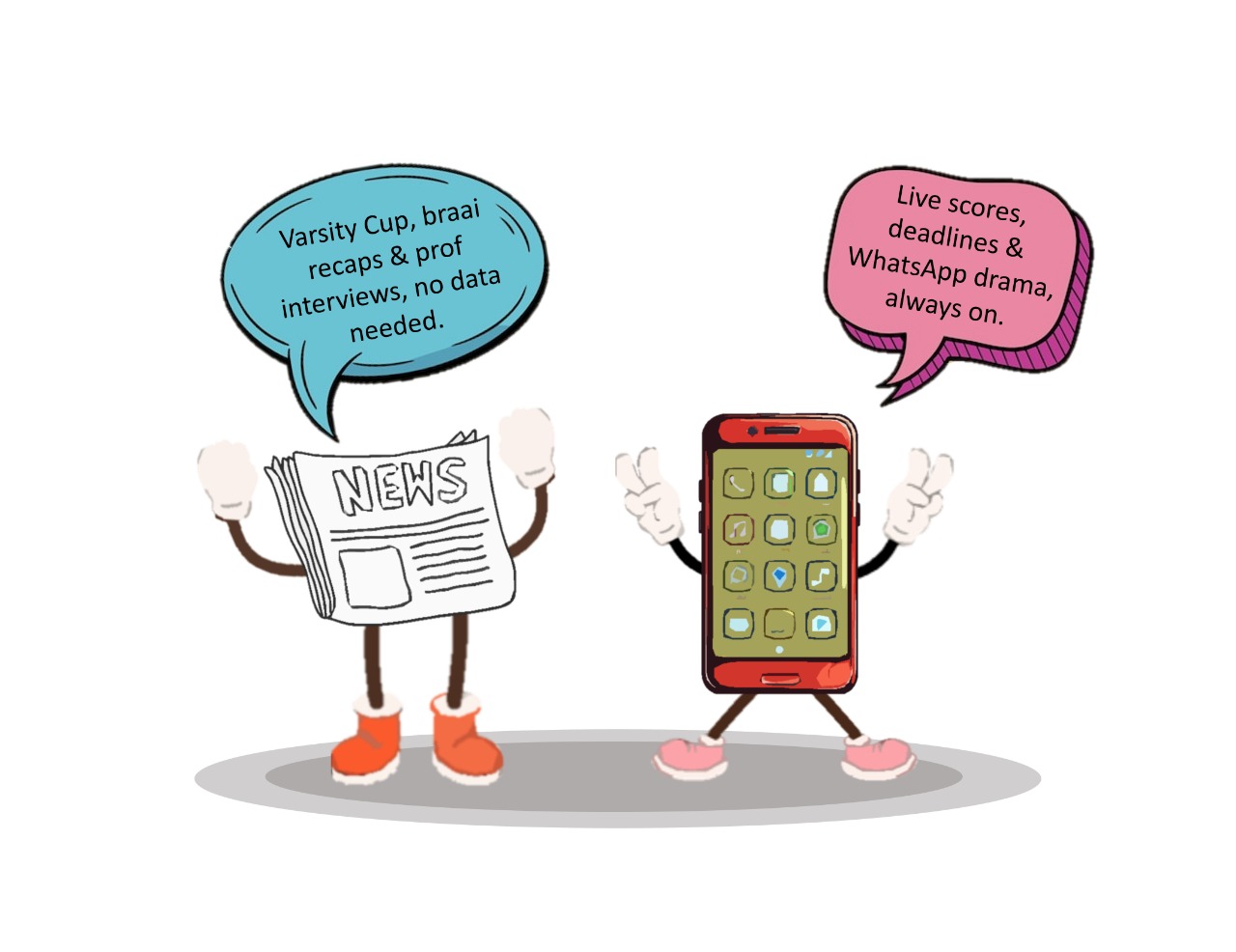 Tuks alumnus and social media influencer Orabile Mashigo, better known as @mashnotpotatoes online, recently debuted his own segment on the Dan Corder Show, and he captures this duality with characteristic frankness. “Print and online in South Africa… it’s a bit of a 50‑50,” he observes. “A lot of South Africans don’t have expendable income to be sending out R14 or R20 for a newspaper. Even if they do, young people’s attention spans have drastically decreased and they don’t have the time to sit down and read an entire newspaper.” And yet, the crucial long reads that probe the nooks and crannies of our society often lurk behind digital paywalls. “I have a subscription with News24, but that’s rare. Many don’t see the value in it.”